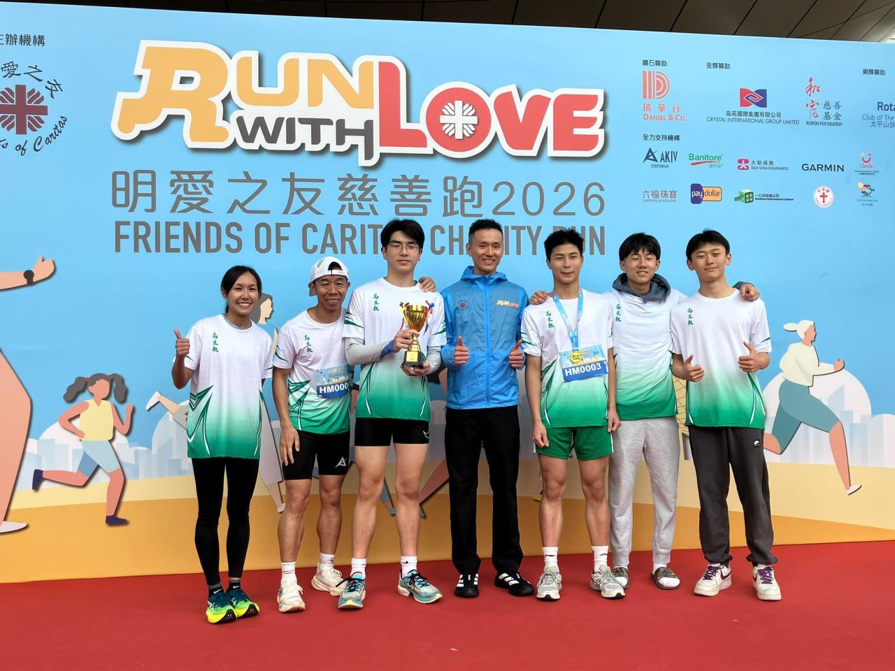 本校超過60位教職員、學生、校友及家長參與「明愛之友慈善跑2026」,當日大家換上學校跑步制服,秉承「堅毅力行」的態度完成賽事。同學們於5公里隊際賽榮獲冠軍,兩位老師Ms. Y.K. Ng及Ms. Y.P. Lam更於所屬組別分別獲得冠軍及亞軍,恭喜所有得獎者,希望所有參加者可以繼續發揚「Run with Love」精神,讓愛一直承傳。